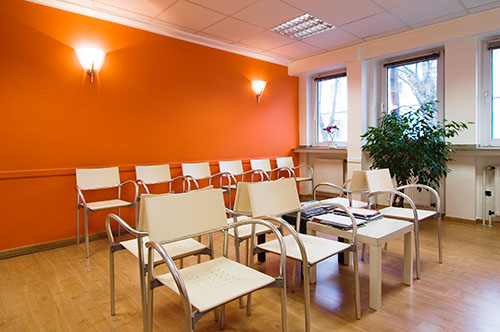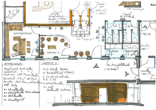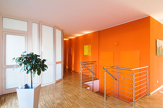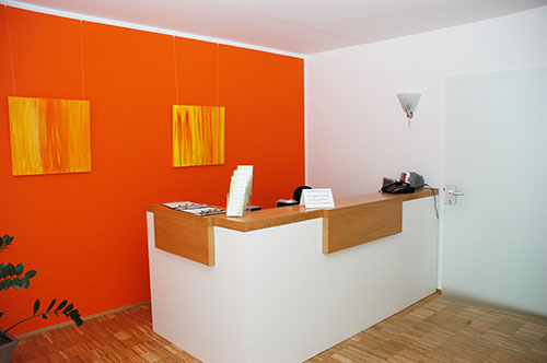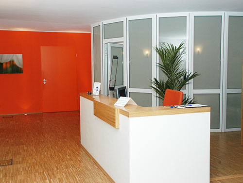 Der Einbau eines neuen Kernspintomographen machte einen Umbau mit Neugestaltung der Praxisräume erforderlich. Hinter dem orangefarbenen Kubus befindet sich der Tomograph. In den geschwungenen Bereichen sind ein Warteraum und ein Besprechungszimmer untergebracht. Das Konzept war so erfolgreich, dass in Kürze eine Dependance eröffnet werden konnte.